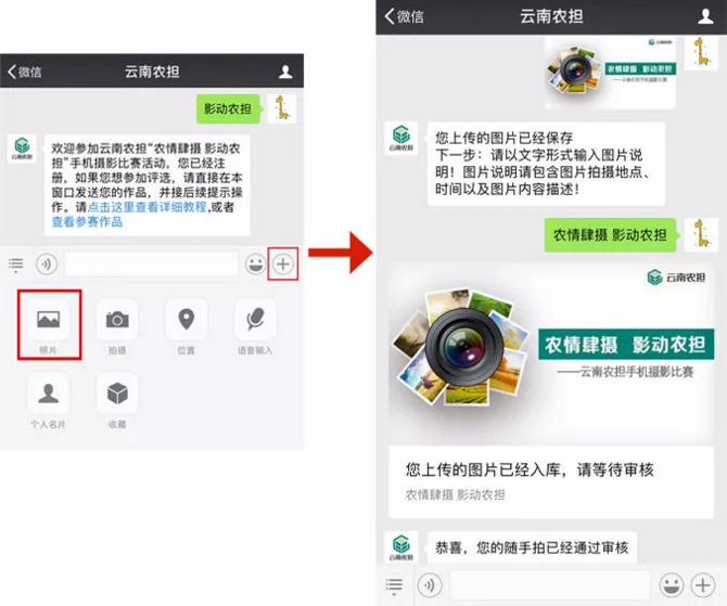 參與方式二:關(guān)注“云南農(nóng)擔(dān)”官方微信號,點(diǎn)擊“農(nóng)擔(dān)+”欄目,選擇“影動農(nóng)擔(dān)”進(jìn)入,查看教程后,完成信息錄入,在對話框內(nèi)發(fā)送1張圖片及一句話描述即可。