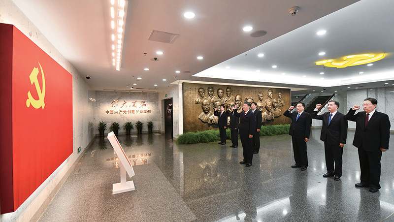 2017年10月31日,中共中央總書(shū)記、國(guó)家主席、中央軍委主席習(xí)近平帶領(lǐng)中共中央政治局常委李克強(qiáng)、栗戰(zhàn)書(shū)、汪洋、王滬寧、趙樂(lè)際、韓正,瞻仰上海中共一大會(huì)址和浙江嘉興南湖紅船。這是31日上午,在上海中共一大會(huì)址紀(jì)念館,習(xí)近平帶領(lǐng)其他中共中央政治局常委同志一起重溫入黨誓詞。