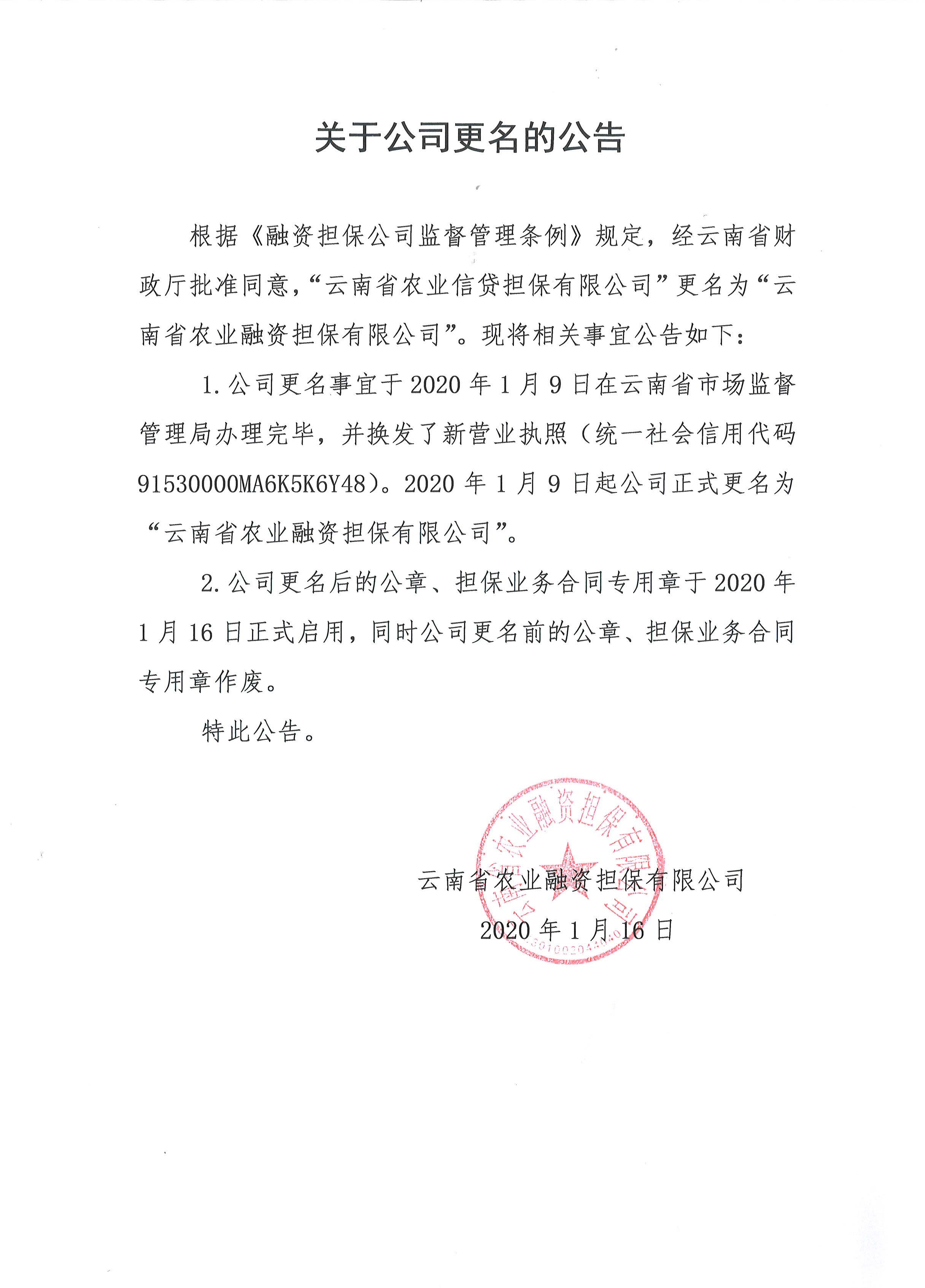 關(guān)于“云南省農(nóng)業(yè)信貸擔(dān)保有限公司”更名公告