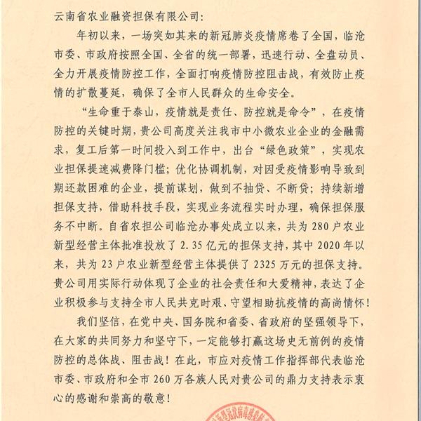 臨滄市應(yīng)對疫情工作領(lǐng)導小組指揮部致函感謝云南農(nóng)擔
